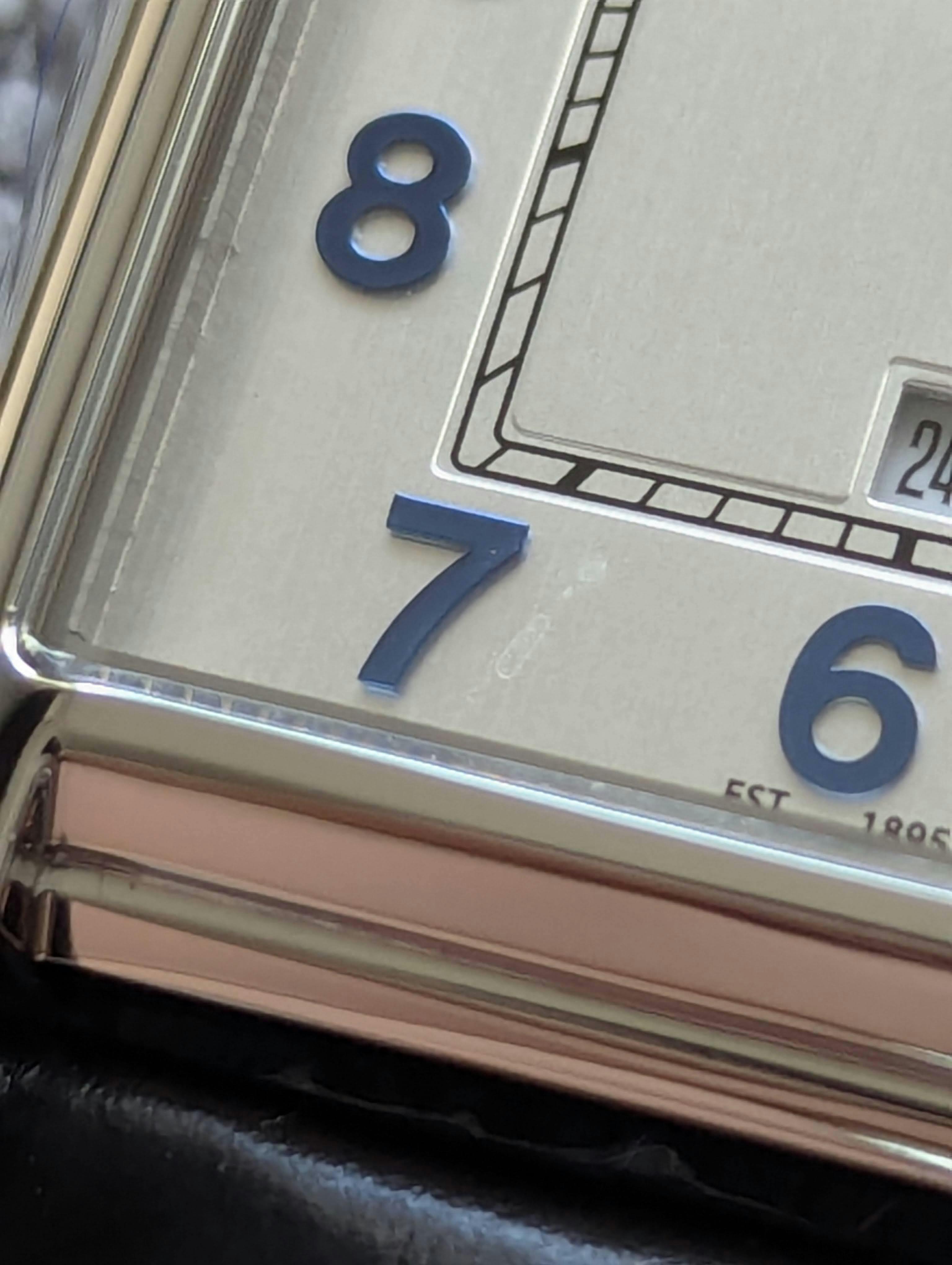Le cadran bleu acier est rehaussé de chiffres arabes bleus appliqués et d'une minuterie rectangulaire noire à l'intérieur. Vers le bas du cadran, on découvre un guichet de date à 6 heures et une paire d'aiguilles bâton noires minimalistes. La couronne dissimulée, accentuant le minimalisme du design, lui confère une silhouette épurée.
