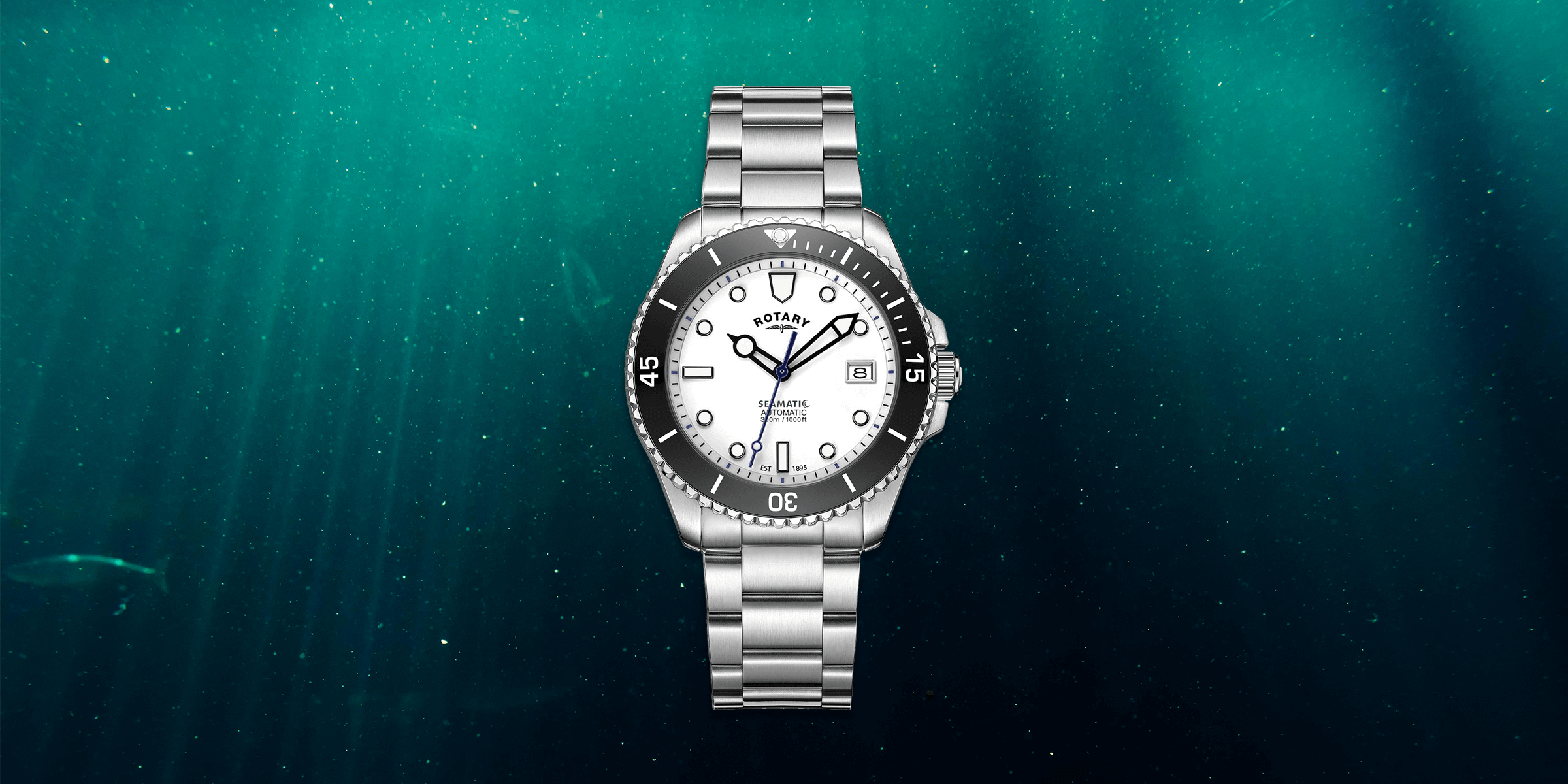 The Rotary Seamatic, the ultimate dive watch for modern adventurers. Combining rugged durability with sleek design, the Rotary Seamatic is your perfect companion for underwater exploration and everyday wear. The 42mm stainless steel case and matching 3-link bracelet ensure lasting durability and refinement, while the striking black ceramic bezel adds a premium feel to the design. The clean white dial is covered by sapphire crystal for superior legibility, ensuring you can easily read the time in any environment.