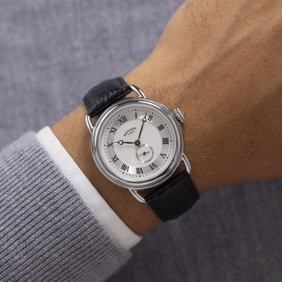 Completing the design is a black genuine leather strap and classic Rotary buckle and sapphire glass for enhanced durability.